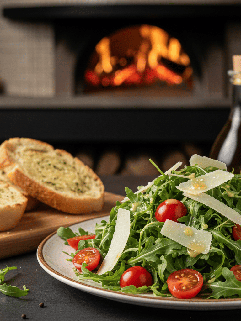 Frischer Rucola mit süßen Kirschtomaten und gehobeltem Parmesan, verfeinert mit nativem Olivenöl und einem Spritzer Zitrone. (G)