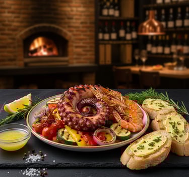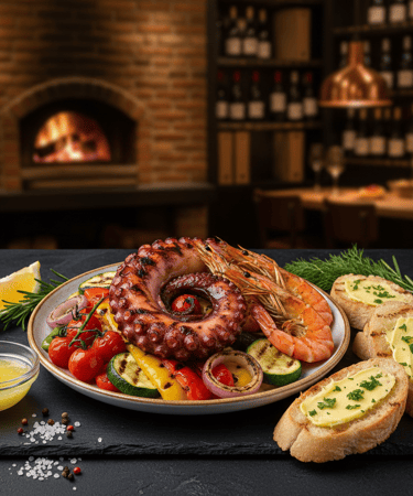 Zart gegrillte Oktopustentakel und edle Garnelen, serviert mit mediterranem Grillgemüse, knuspriger Baguette und einer hausgemachten Zitronen-Knoblauch-Butter. (A, B, R, G)