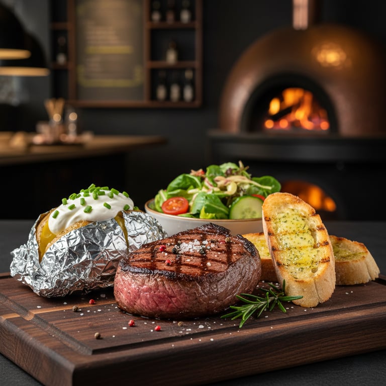 Ein erstklassiges, mageres Steak aus der australischen Rinderhüfte, auf Lavastein zubereitet. Außen würzig-kross und innen wunderbar saftig. Serviert mit einer Folienkartoffel (mit Sauerrahm), einem frischen Salatbouquet und knusprigem Grill-Baguette mit Kräuterbutter. (A, G)